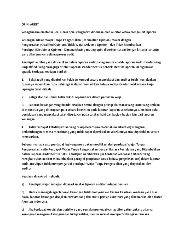 Kami yakin bahwa audit kami memberikan dasar memadai untuk menyatakan pendapat Menurut pendapat kami berdasarkan audit kami dan laporan auditor independen lain yang kami sebut di atas laporan keuangan konsolidasian yang kami sebut di atas menyajikan secara wajar dalam semua hal yang material posisi keuangan perusahaan KXT dan anak. Ada lima jenis audit yang diterbitkan oleh auditor yaitu sebagai berikut. Sebelum membahas lebih jauh tentang jenis-jenis opini audit ada baiknya kita mengetahui pengertian audit.